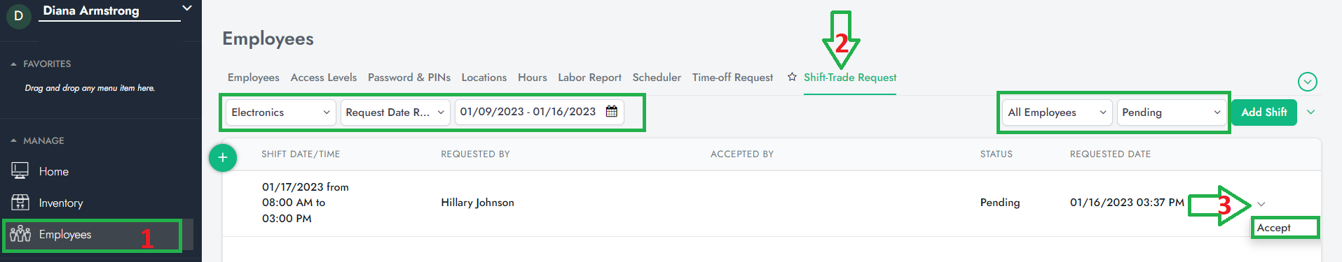 8. The employee can use the filters that help to navigate the request as given in the picture below. To accept the shift trade, click on the "V" drop-down next to the shift and click on "Accept"