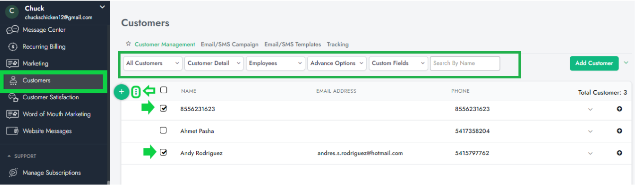 5. Click on the drop-down (3 dots) located in the left-hand corner of the customer list