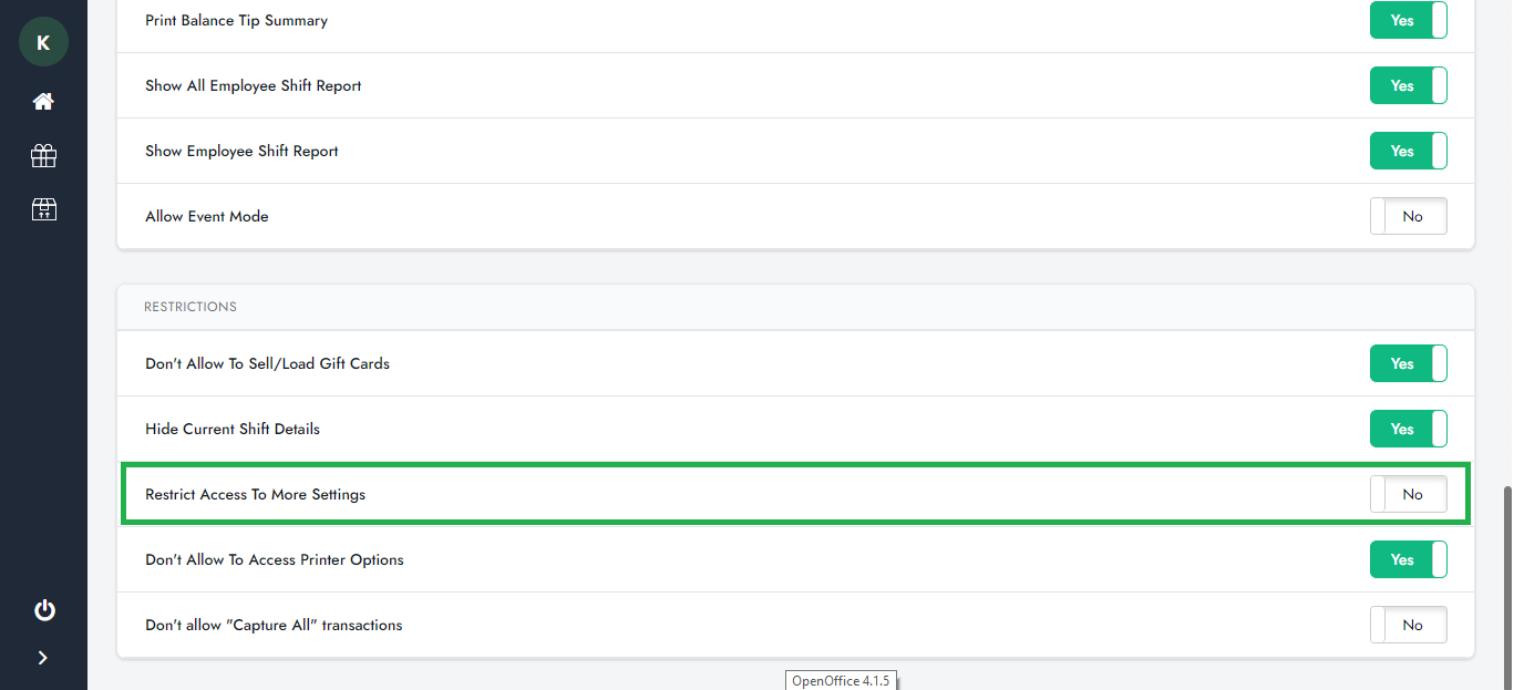 The SalesVu POS app has several different settings that allow the user to customize their POS app. You can now prevent employees from manually making changes under 'More Settings' by restricting their access to this option. If you want to learn more information about access level please follow the link:Overview: Employee Device Access Level