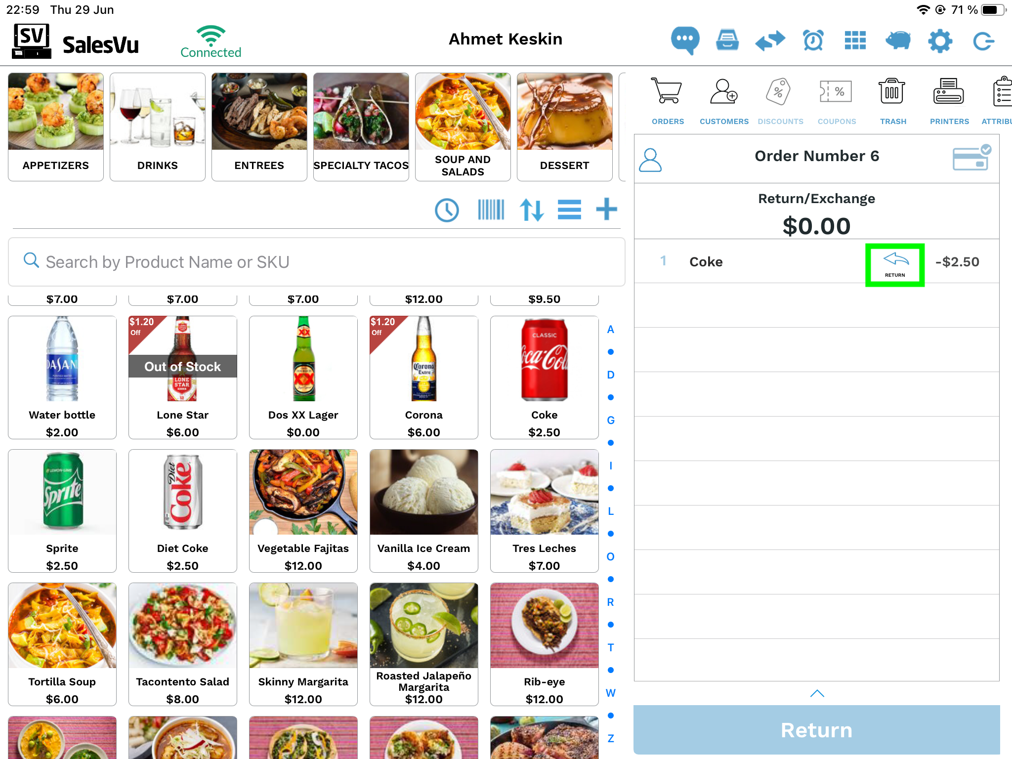 For example, let's say initially we sold Sprite for $2.50 and now we added Mojito for $10.00. The system will show you the Order Total and you can touch the 'Return' button and select the form of the store credit.