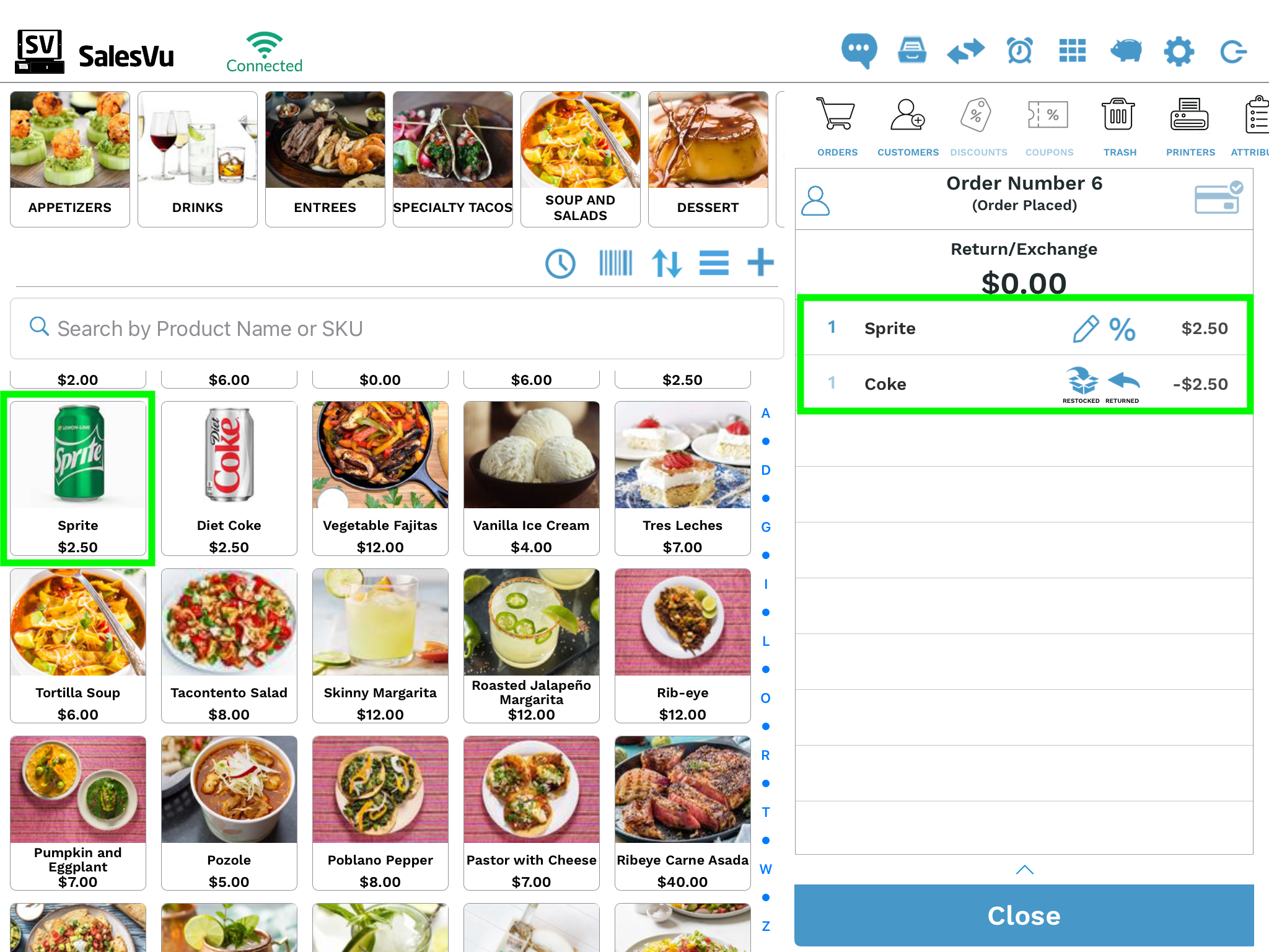 Example 1: let's say, in the original sale, we sold Coke, and now we touch the Sprite icon, which will be added to the order details. In this example, both Coke and Sprite have the same price, resulting in a total price of $0.00.