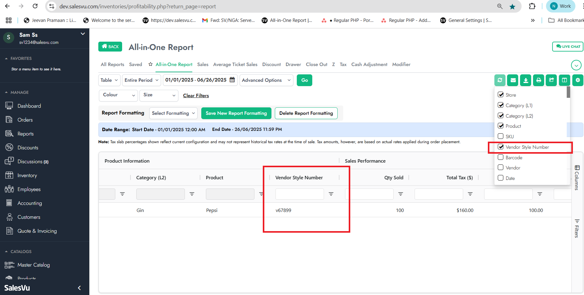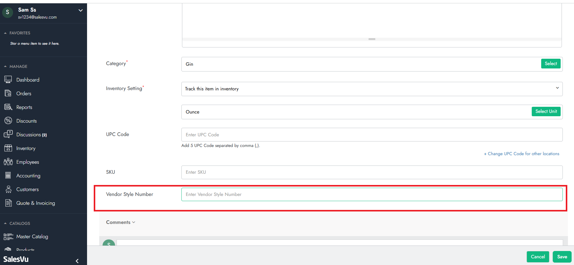 The Vendor Style Number field allows you to input and store the vendor’s version of the SKU. This information can be accessed in All-in-One Reports and Custom Reports, making it easier to match internal SKUs with vendor references.