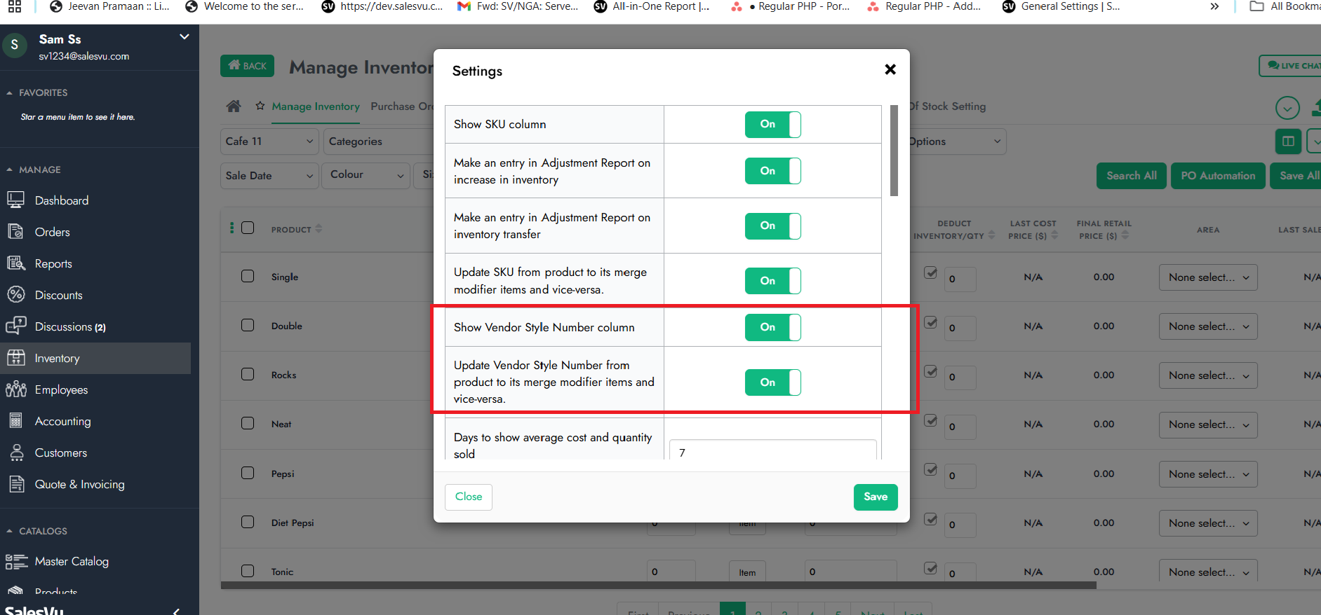For example, if you have a product called T-Shirt and you later create modifiers for it such as Small and Large, then merge them with the product, you will see separate products for each size in your inventory tracking. With this setting on, the Vendor Style Number will automatically apply to both the main product and its merged modifier items. Similarly, if you unmerge the modifiers and revert to a single product, the Vendor Style Number will update automatically on the main product as well.