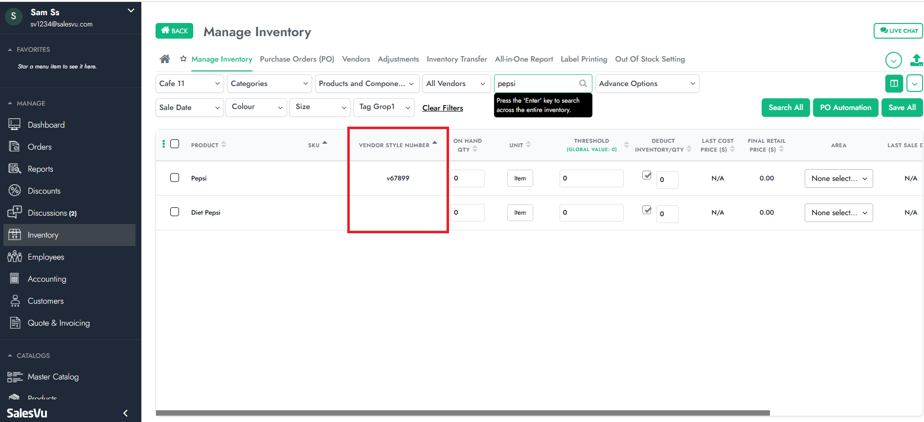 Once enabled, the Vendor Style Number column will be displayed in the inventory view.