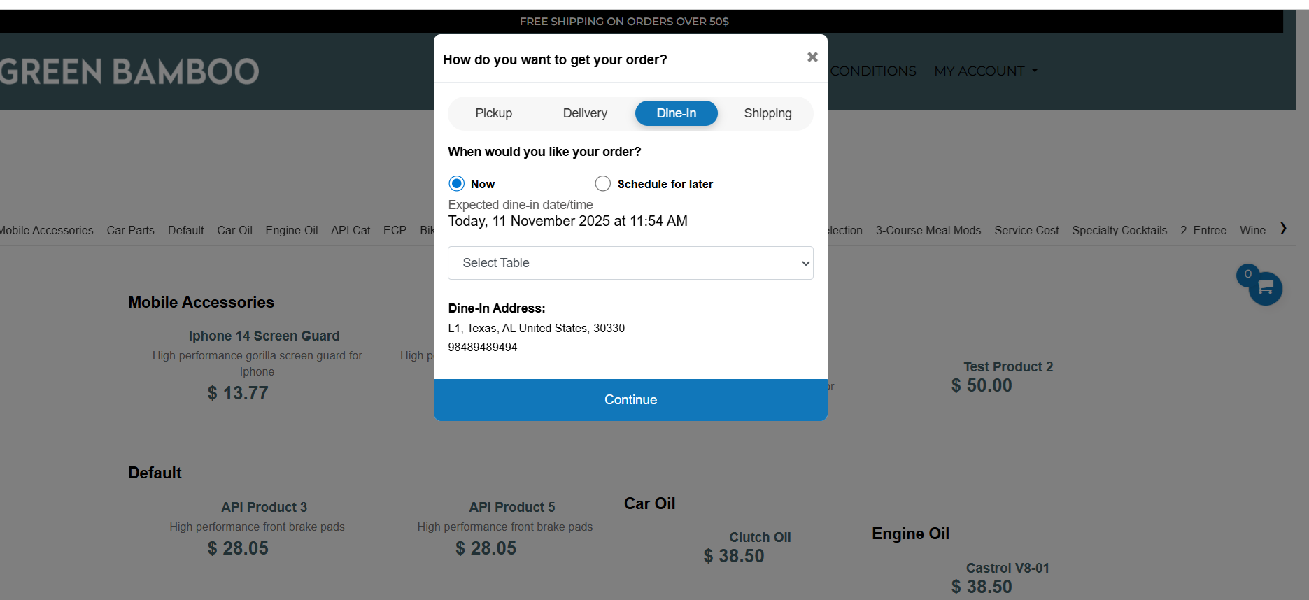 You can allow customers to select a dine-in time when placing an online order. After enabling this feature, customers can choose whether they want to dine in now or schedule for later, and they’ll also be able to select a table.