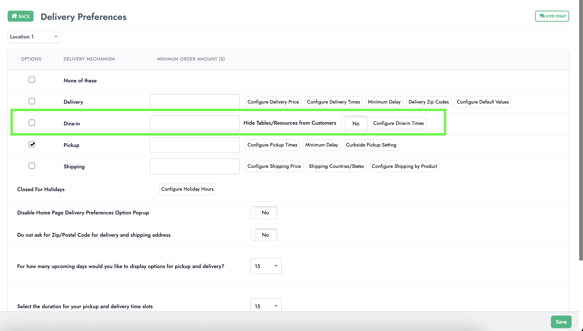 Check the option for Dine-in, then click Configure Dine-in Times to set up your available time slots.