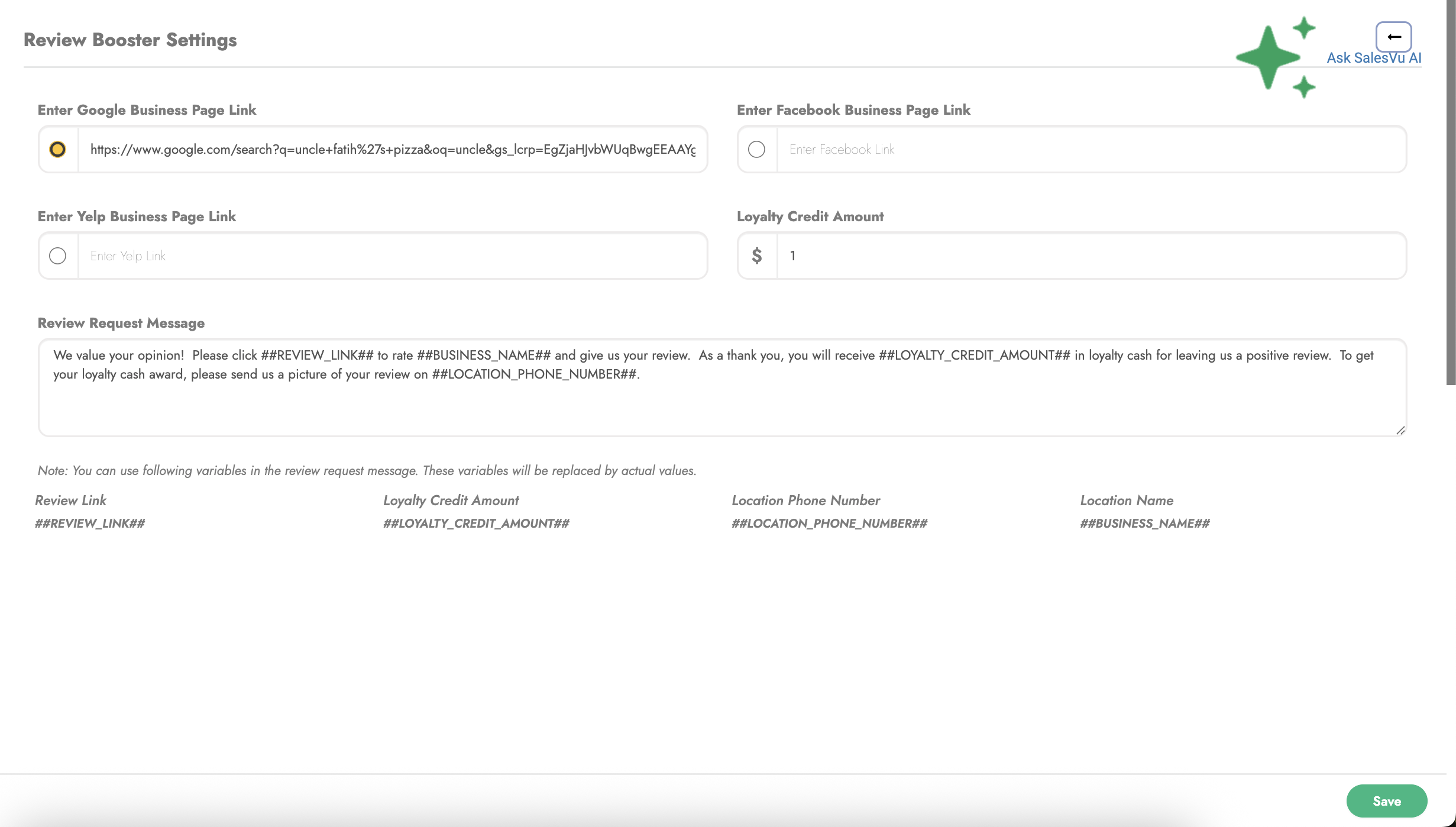 The Review Booster feature helps you automatically collect customer reviews via email and SMS after a purchase. You can choose where customers are redirected to leave a review—Google, Yelp, or Facebook—customize the review request message, and even reward customers with loyalty credit for sharing their feedback.