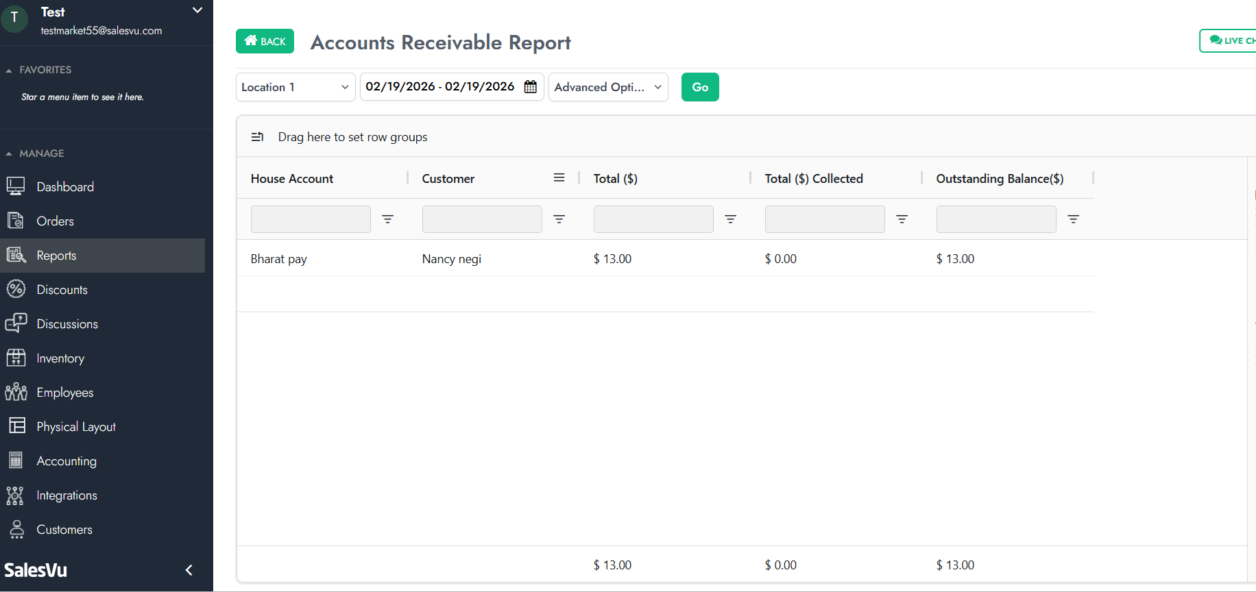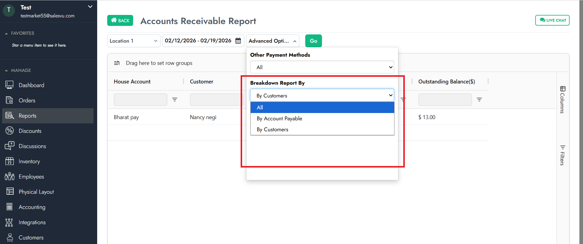 The Accounts Receivable Report allows you to track unpaid balances, collected amounts, and outstanding balances for house accounts over a selected period. Using the Breakdown Report By option, you can customize how the data is grouped, making it easier to review balances by customer or account.