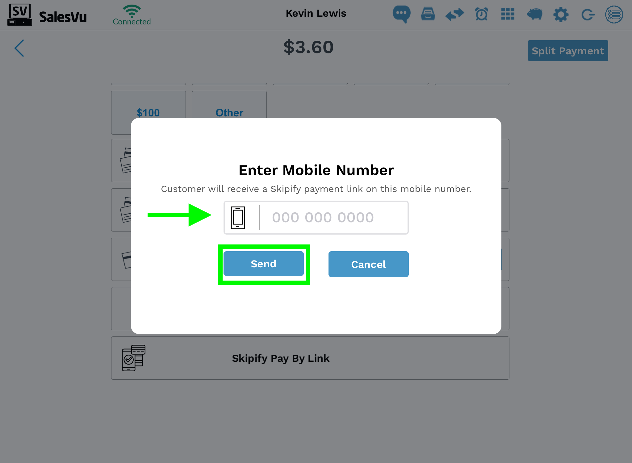 4. Enter the Customer's phone number. Tap on the "Send" button to send an SMS with the payment link to the customer